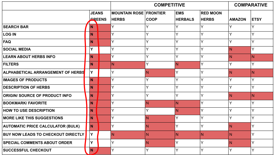 Jean’s greens current website doesn't have 13 out of the 17 features that were compared